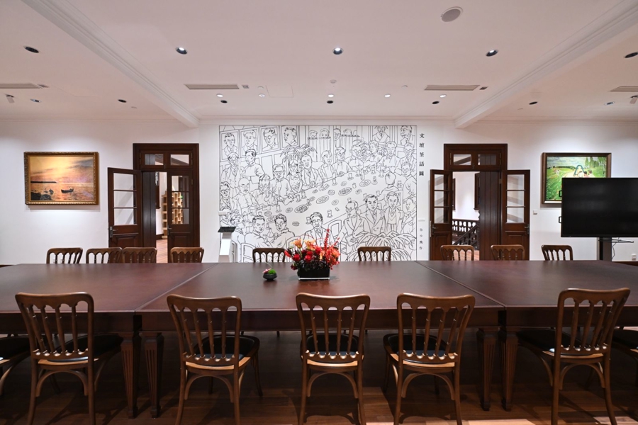 巴金图书馆图书阅览室墙上的鲁少飞《文坛茶话图》